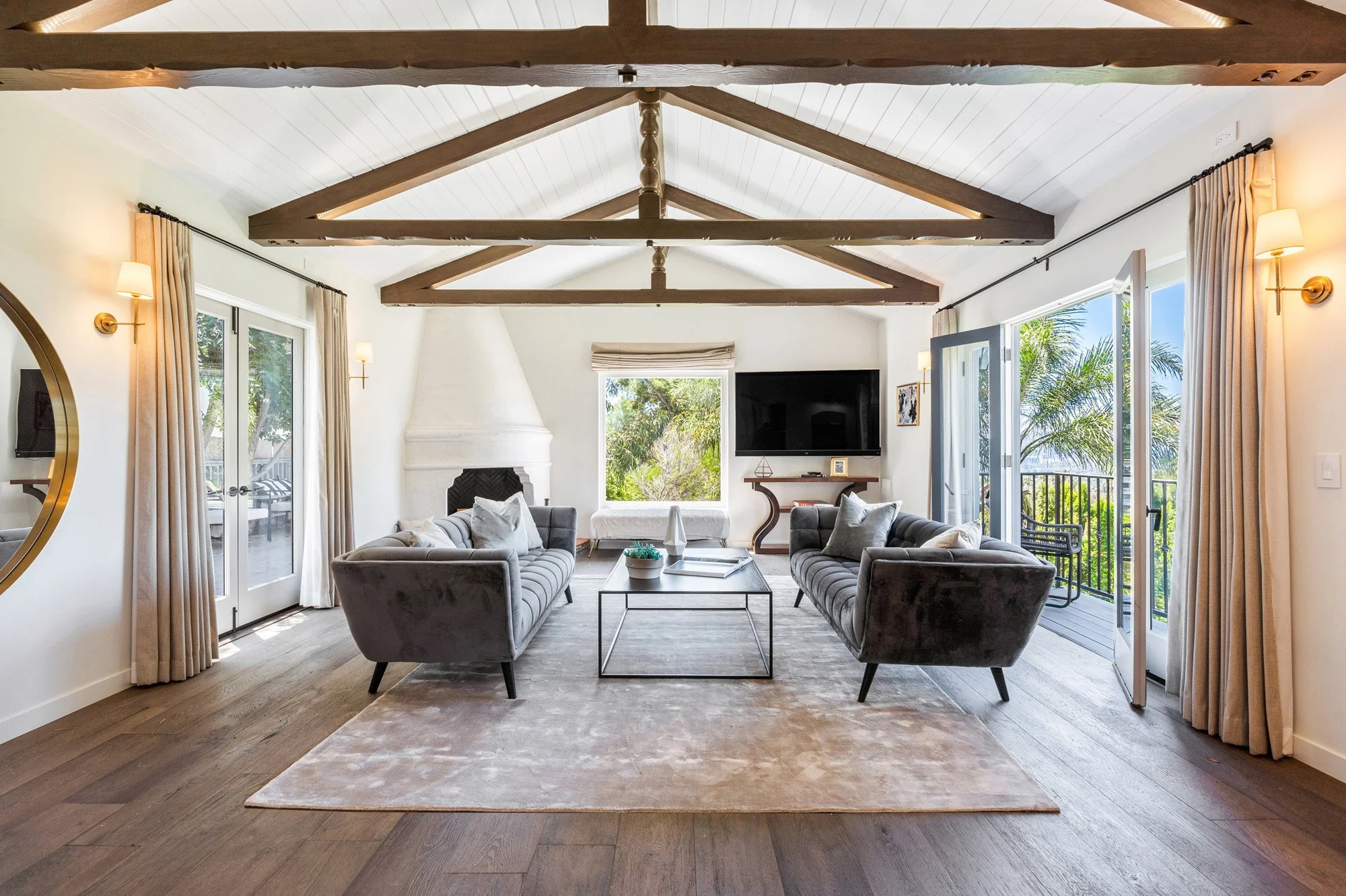 SEQUESTERED BEHIND HEDGES IN PRIME LOWER BIRD STREET LOCATION. A complete remodel has transformed this gorgeous Spanish into a beautiful classical contemporary. Fully furnished and turnkey, with spectacular city and ocean views from every room. The main floor features a classic foyer leading into a living room with a beamed ceiling, fireplace, and French doors to an outdoor dining patio and balconies.